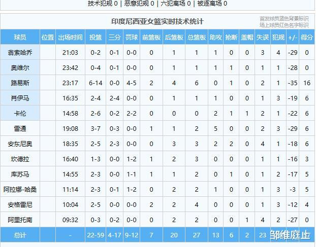 上半场中国女篮49-20领先印尼女篮29分。意料之中的事情,双方的差距太大了,无论是身体或者技术层面上。好的地方就不说了,不足之处在于失误过多,以及篮板球保护不好,打强队这样会吃大亏的。张子宇中规中矩,没有怎么出汗。