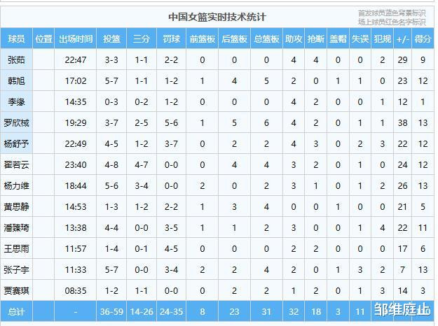 半场数据:翟若云9分2板1助2断、张子宇7分3板1助、韩旭7分2板2助、黄思静5分4板、潘臻琦4分2板、张茹4分1助3断、杨力维4分1助、罗欣棫3分4板4助、杨舒予3分1板1助、王思雨3分1助、贾赛琪2板、李缘2助
